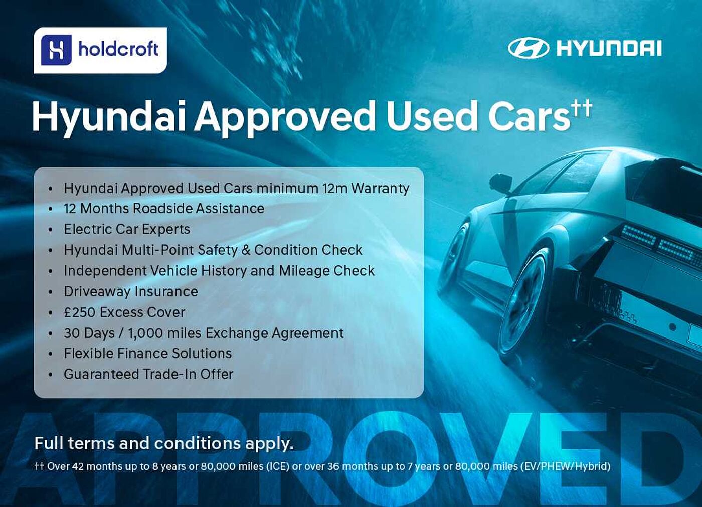 You can buy with peace of mind when purchasing a Used Car from one of our retailers, whether you purchase a Hyundai Promise vehicle or a standard Hyundai Approved Used Car, both come with the balance of the manufacturer warranty for cars less than 5 years old or retailer supplied warranty options for cars more than 5 years old. All Hyundai Approved Used cars are prepared by our trained technicians – and Electric Experts for our EVs. Hyundai Promise cars come with a minimum of 24 months Hyundai warranty, that can be upgraded to a 5-years Hyundai warranty (at additional cost, contact your retailer for further information). To be classified as a Hyundai Promise car, the Hyundai car must have less than 60,000 miles on the clock or be no older than 36 months old. Our standard Approved Used cars also come with a warranty – Balance of manufacturer warranty for cars less than 5 years old, or retailer supplied warranty options for cars more than 5 years old. This is applicable to Hyundai cars with less than 80,000 miles and no older than 8 years old (petrol/diesel), or 7 years old if electric, plug-in hybrid or hybrid.