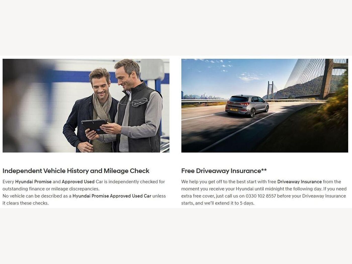 Hyundai Promise cars come with a minimum of 24 months Hyundai warranty, that can be upgraded to a 5-years Hyundai warranty (at additional cost, contact your retailer for further information). To be classified as a Hyundai Promise car, the Hyundai car must have less than 60,000 miles on the clock or be no older than 36 months old.